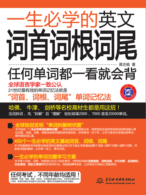 英文單詞上萬個(gè),詞首、詞根、詞尾也是數(shù)不清,這么多怎么可能背得完。在本書特別整理出英文學(xué)習(xí)者必學(xué)的100個(gè)基礎(chǔ)詞首+250個(gè)詞根+100個(gè)詞尾。每個(gè)詞首、詞根、詞尾都有詳細(xì)的解釋,讓讀者可以舉一反三,學(xué)習(xí)單詞事半功倍。